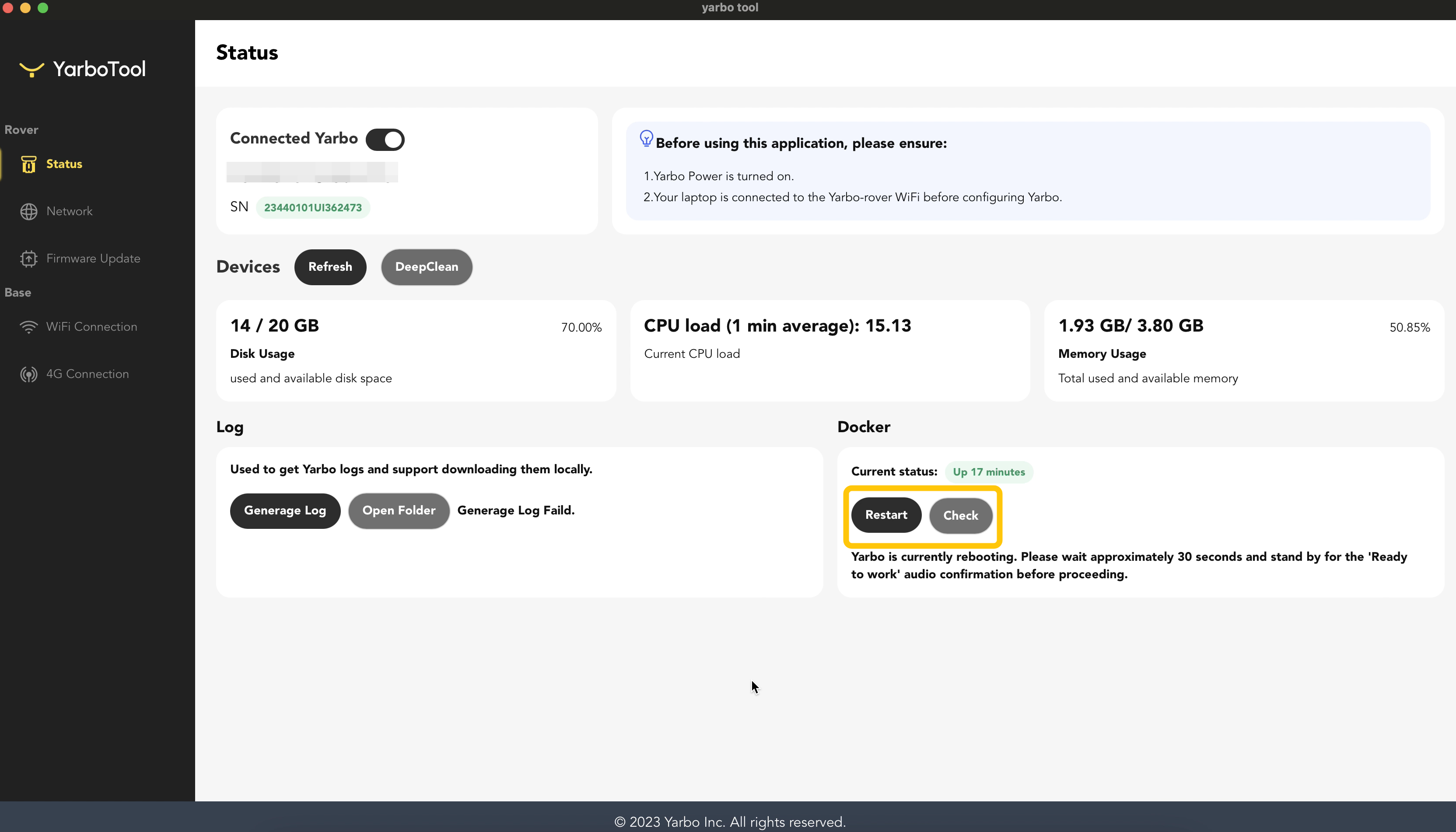 Rover is stuck displaying colorful lights and will not reboot.(Rover → Status → Deep Clean / Restart in Docker)