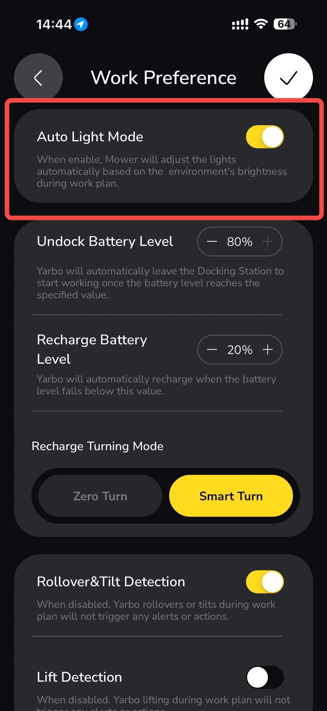 You can find the toggle under: Yarbo App β Settings β Work Preferences β Auto Light Mode