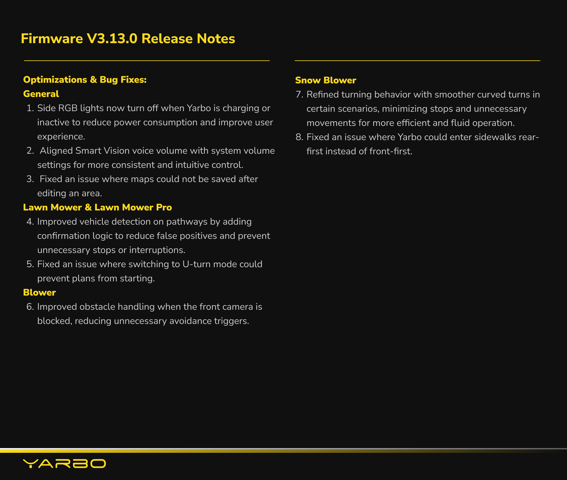 We're excited to announce the upcoming release of Firmware 3.10.0 and App Version 3.16.0, packed with powerful new features and enhancements designed to elevate your Yarbo experience.