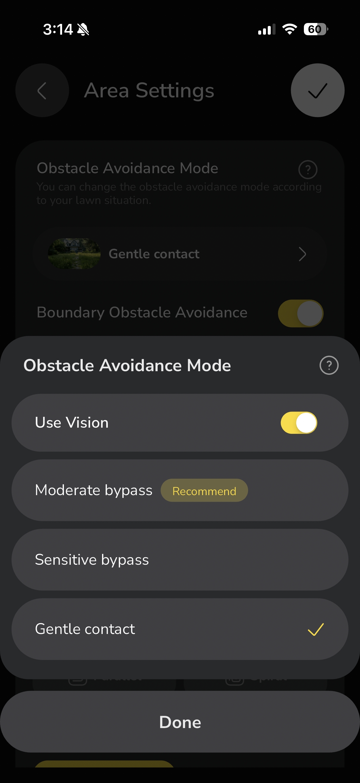 When Use Vision is turned on, even in Gentle Contact mode, Yarbo will first slow down after visually detecting an obstacle, then continue until the bumper bar makes contact before bypassing.
