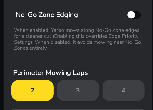 Similarly, adjusting the Perimeter Mowing Laps setting will determine how many laps Yarbo makes around the perimeter. More laps mean more time spent on the task.