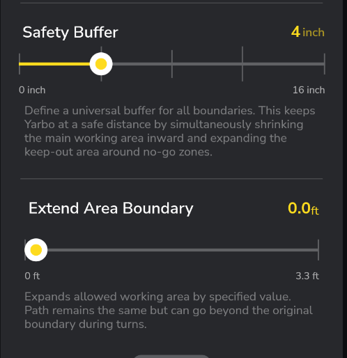 Expands allows working area by specified value. Original path remains the same but allows user to customize how far Yarbo can extend beyond the boundaries during turns. Available range: 0 to 3.3 feet.