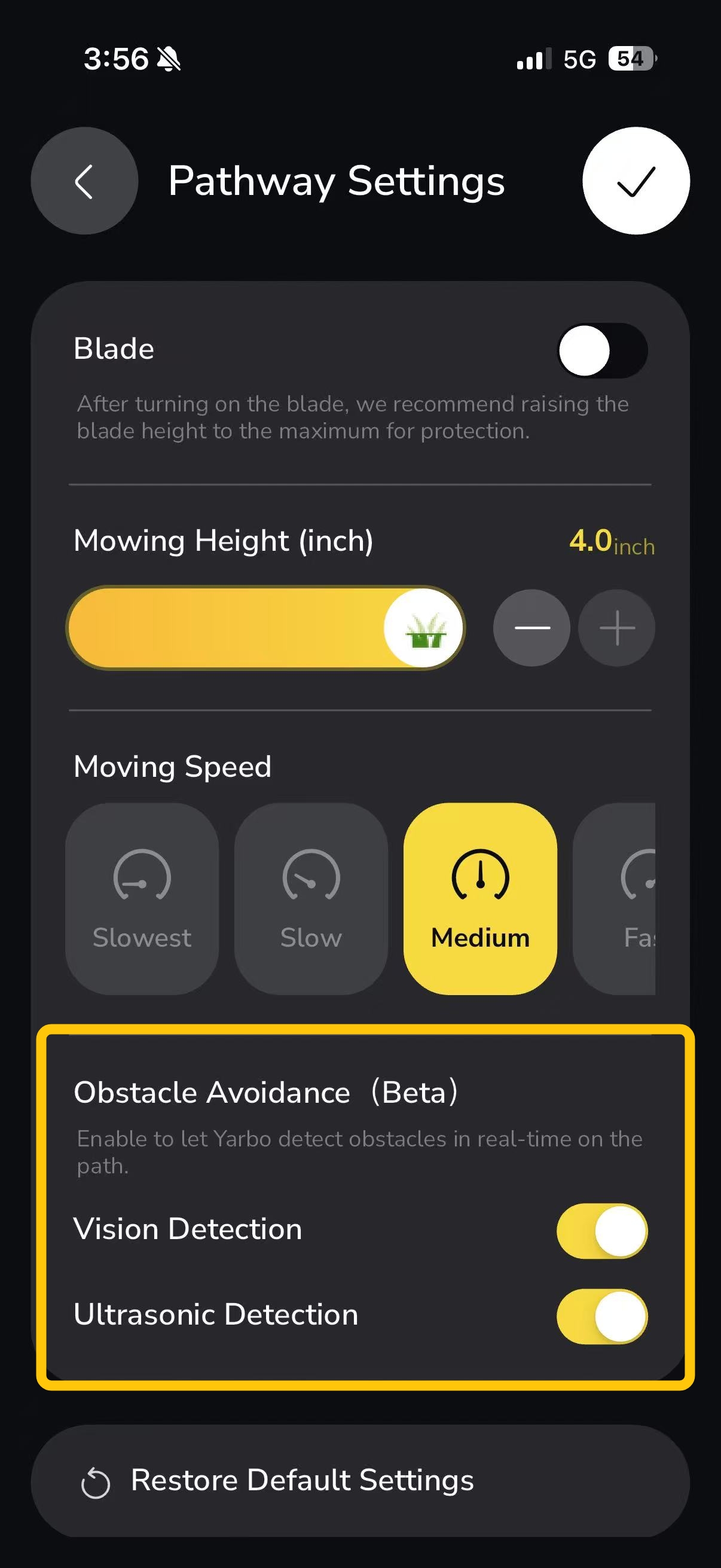 In some scenarios, constant triggering of false obstacle detection on pathways can cause Yarbo to repeatedly leave the pathway and return, reducing operational efficiency. By allowing users to adjust Visual and Ultrasonic independently, Yarbo provides: