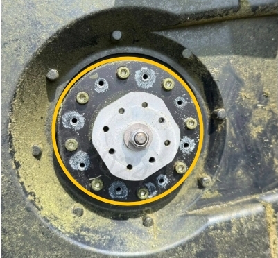 Advanced step (use with caution): In rare cases, debris may also accumulate around the silver spindle under the cutting disc. Removing the nut and spindle can allow deeper cleaning, but since the spindle is part of the motor assembly, improper handling may cause malfunction. Attempt this only if necessary and at your own risk.