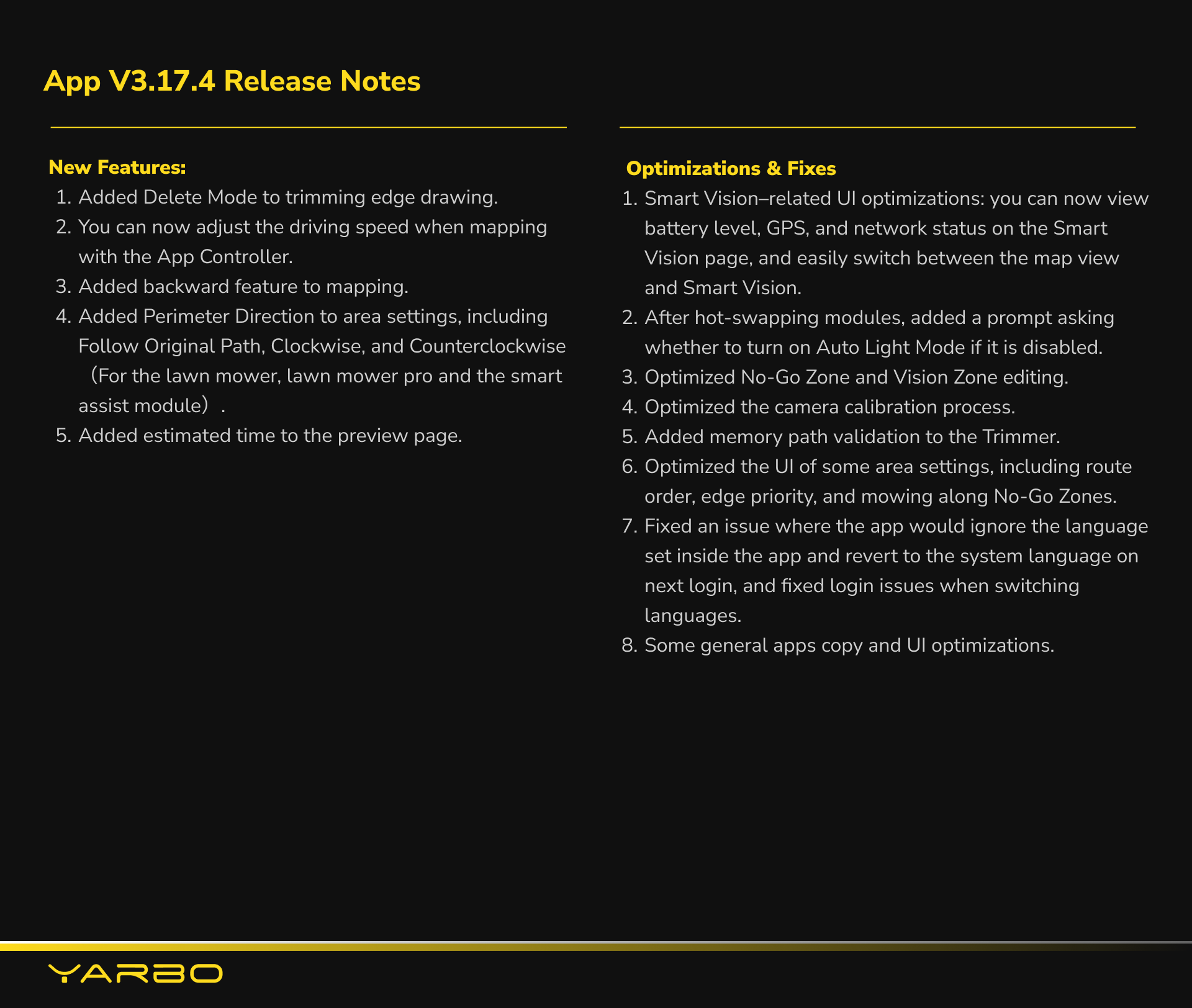 We're excited to announce the upcoming release of Firmware 3.10.0 and App Version 3.16.0, packed with powerful new features and enhancements designed to elevate your Yarbo experience.