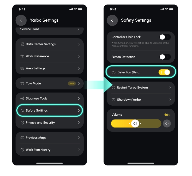A:You can find this option under Yarbo Settings → Safety Settings → Car Detection (Beta).
