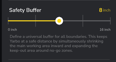 Adjusts the entire mapped area inward by a selected value to avoid tight edges or obstacles. Available range: 0 to 16 inches, in 4-inch increments. Define a universal buffer for all boundaries.