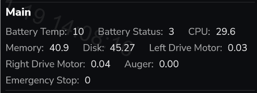 The Main module provides details about the machine's operational parameters, including battery, CPU, memory, and motor statuses.